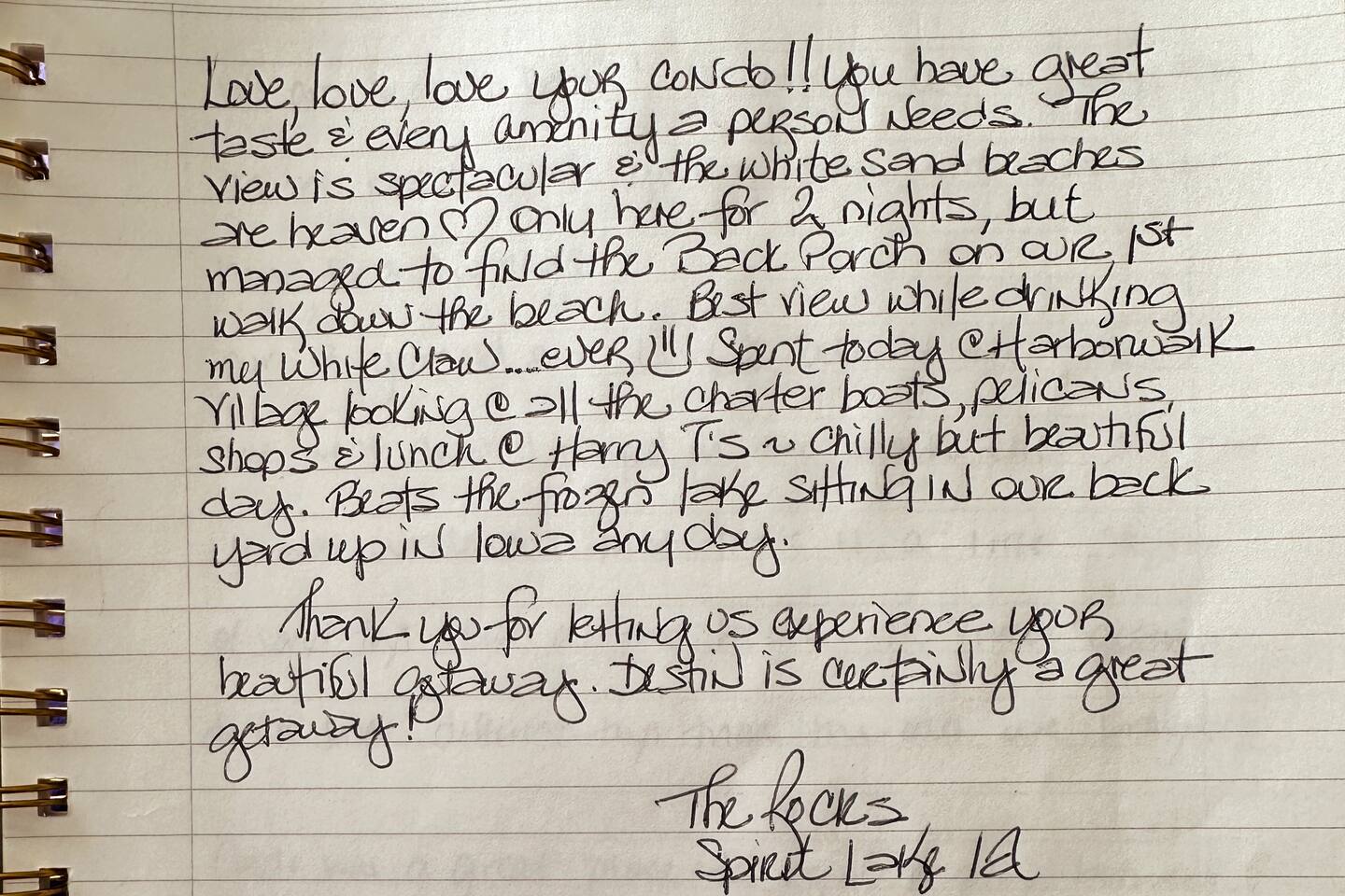 Wake up to endless emerald-blue Gulf panoramas from the 15th-floor balcony. Walk straight to the sand, pools and on-site café in seconds. Inside: 2 spacious bedrooms, full kitchen, washer/dryer and fast Wi-Fi. Smart TVs in every room keep everyone entertained. Resort pools & hot tubs Free parking & 24-hr security Steps to dining, shopping & water sports Book now and claim your front-row seat to Destin’s famous sunsets! *Pelican Beach Resort - consistently rated a Top 5 resort! *Family owned and managed (no giant property managers!!) *Balcony access from your living room AND master bedroom *Fireworks that are are shot off weekly over Destin Harbor can be viewed from your balcony! *Newly renovated and professionally decorated *Granite countertops, Stainless appliances, Fully stocked kitchen *Keurig and normal coffee pot *Blender *TVs in both bedrooms and the living room (with Roku) *Washer/Dryer in unit *Games and movies for rainy days *Books to borrow - take one or leave one! *2 beach chairs, umbrella and a few sand toys *Pack n Play, high chair, and plastic dinnerware for our youngest guests *Gas grills *Pickleball and Tennis courts *Basketball court *Sauna *Gym *4 pools *2 hot tubs *Tiki bar with the BEST cocktails *Cafe with amazing food - get a pizza delivered to your chairs on the beach! *EV chargers Conveniently located: *2 grocery stores nearby - Winn Dixie and Publix (Shipt/Instacart available!). Target is right there too! Or use Destin Grocery Girls to have your groceries purchased and delivered in the condo before your arrival! *Big Kahuna Water Park, The Track (go carts, mini golf) and amazing Shake's frozen custard right across the street! *Restaurants galore: Walk down the beach front to The Back Porch! The Pancakery, Merlin’s Pizza, and Blalock's Seafood Market all right here! *Silver Sands outlet mall *Souvenir shops: Alvin's Island and Sunsations right next door